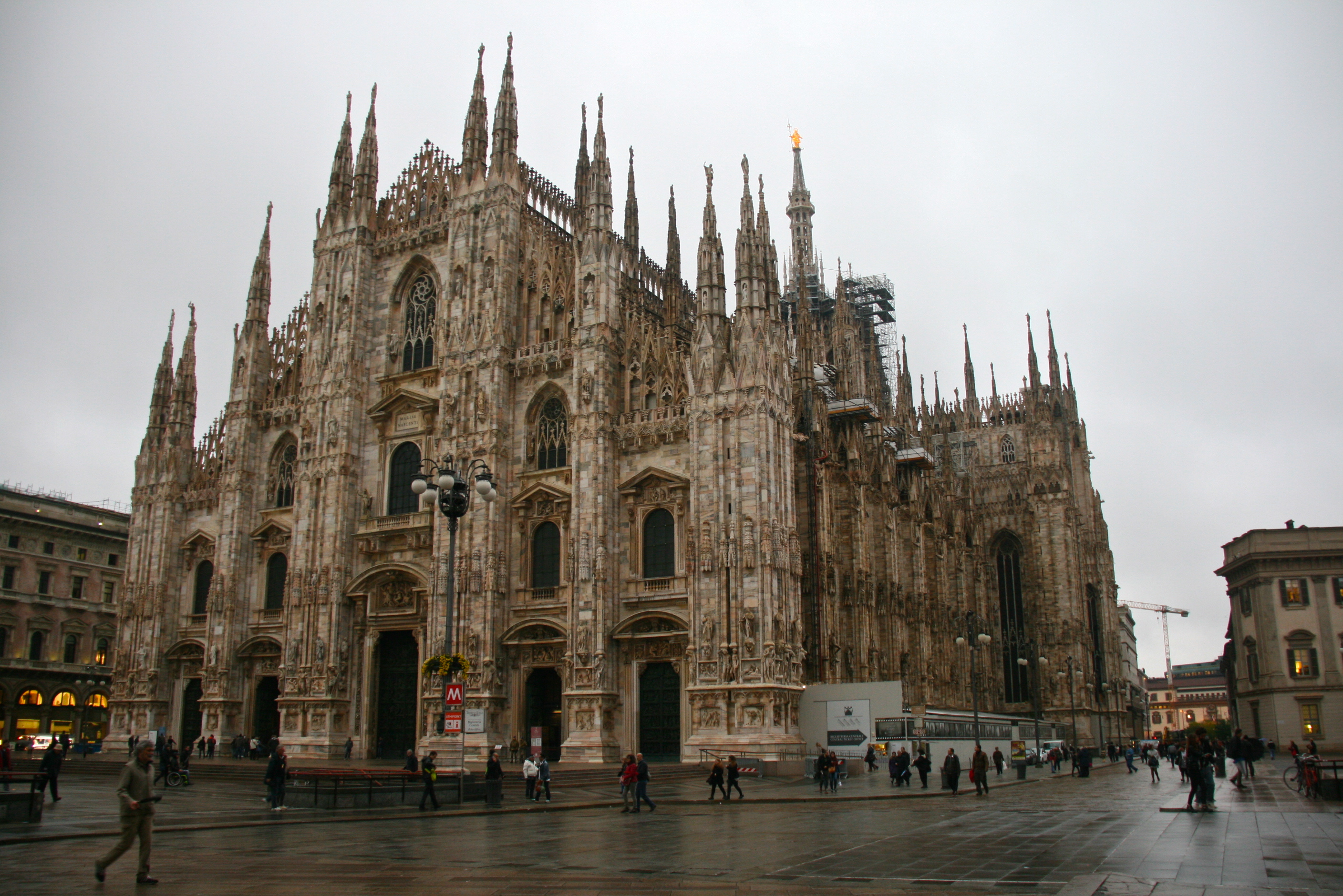 I’m packed up and planning on leaving my bag at Cadorna, the nearby train station, but as it turns out, they have no lockers (pro tip: they do have lockers at the Centrale station), so I end up wheeling my little suitcase through the rain to the church, over the cobblestones. I purchase a 5-euro umbrella from a street vendor, since I have brought no rain gear, and I have my luggage in one hand and the umbrella in the other. Due to how lightly I packed, this is not as horrible as it sounds. I try to think of it as forearm training for rock climbing.