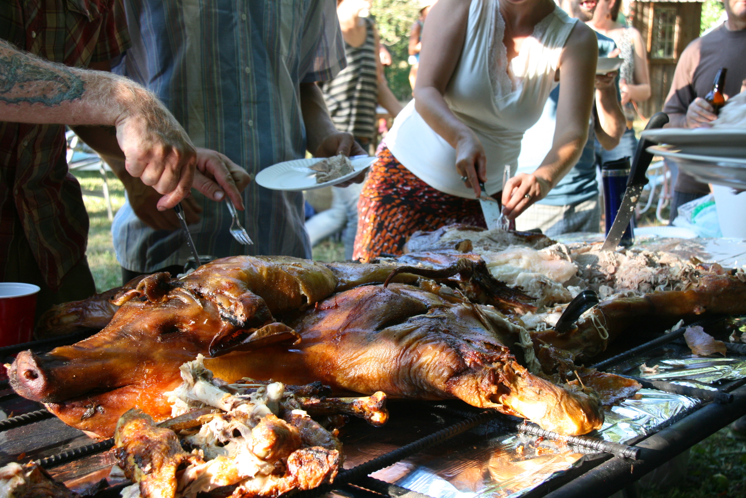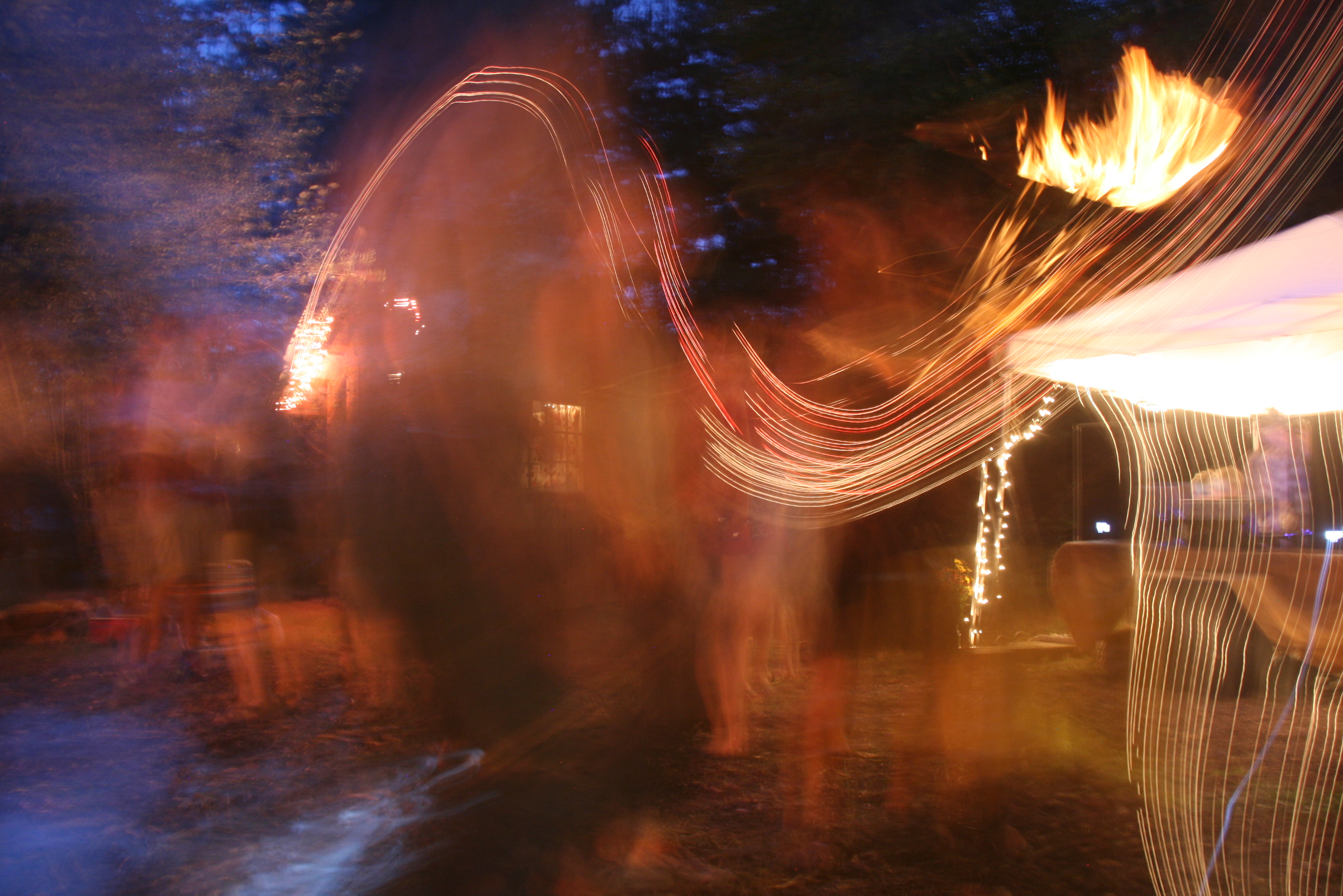 I dace barefoot with this assembled tribe in a trampled-down clearing in the forest, sun sinking, disappearing. The day is night, we are night, swaying like darkness now, trees looming overhead and summer heat lingering in the grasses. Children, men and women, we dance and dance, fueled by the flesh of the animal we have consumed together.