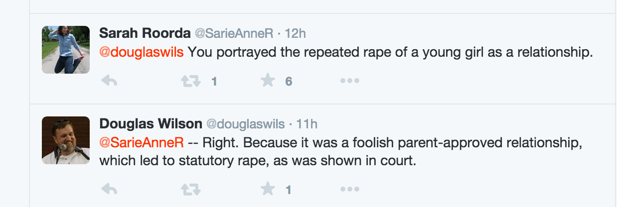 However, Doug has been getting sloppy lately with his discourse and is actually going on record with things that are easily provable as false. What Doug has asserted in writing recently: that “it [the Jamin Wight/Natalie case] was a foolish parent-approved relationship, which led to statutory rape, as was shown in court.” Doug Wilson tweet