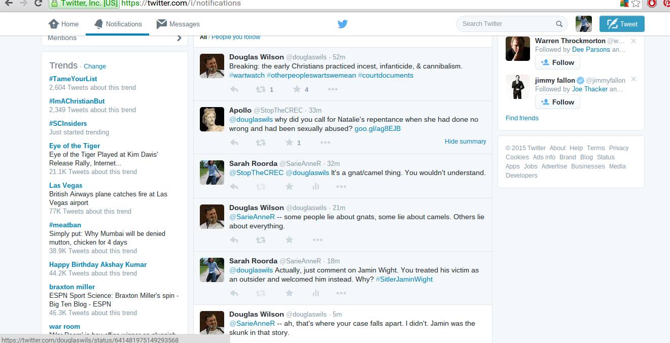 But I would probably have a heart attack if Doug Wilson did either of these things. What we will likely see, instead, is what we’ve seen all along: more of the carefully-worded “my bad behavior was someone else’s fault,” more revising of clear historical statements in the vein of “see, when I said that Jamin was not a sexual predator, I actually meant that he was sexual predator — and it’s your fault if you couldn’t tell what I really meant,” or “I sneezed in Natalie’s direction once, and she didn’t take this as a sincere apology, so what are you going to do?”
